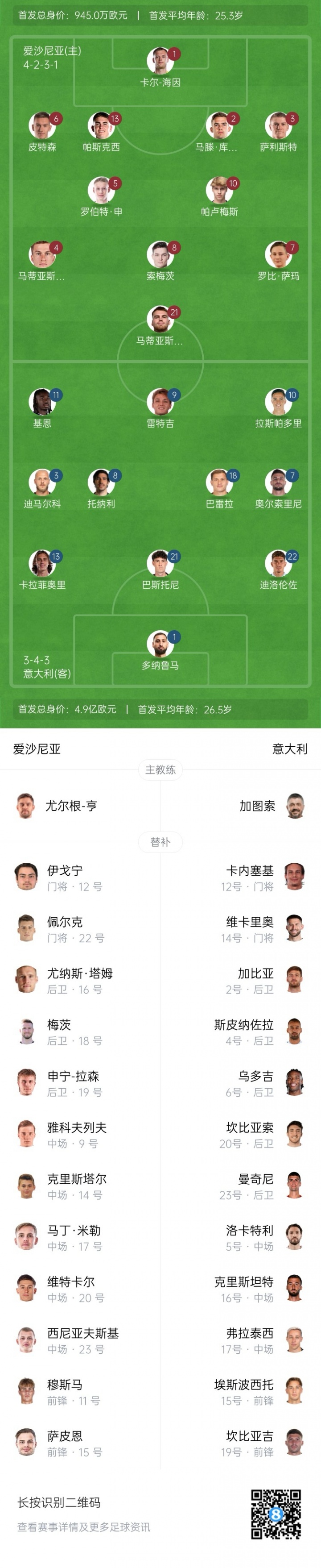 意大利vs爱沙尼亚首发:托纳利、巴雷拉、雷特吉、卡拉菲奥里出战