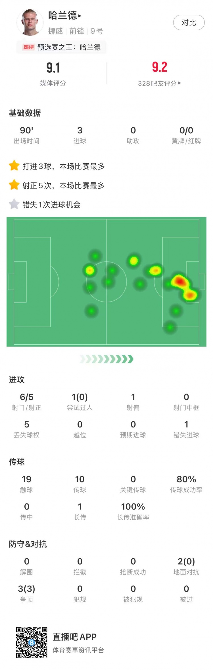 帽子戏法!哈兰德本场数据:6射5正3进球,评分9.1全场最高