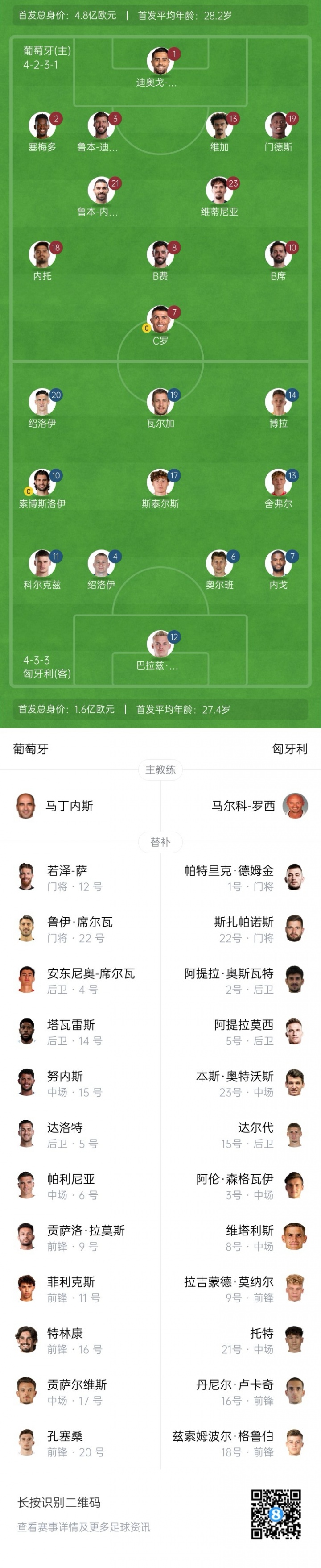 葡萄牙首发:1-迪奥戈·科斯塔、2-塞梅多、3-鲁本·迪亚斯、13-维加、19-努诺·门德斯、8-B费、21-鲁本·内维斯、23-维蒂尼亚、10-B席、18-内托、7-C罗