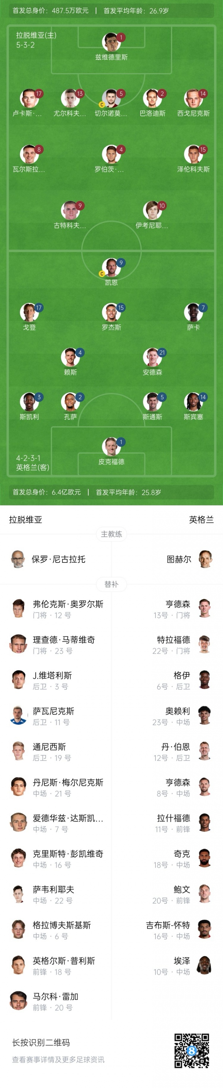 英格兰替补:13-迪恩-亨德森、22-特拉福德、6-格伊、23-奥赖利、12-丹-伯恩、8-亨德森、11-拉什福德、18-奇克、20-鲍文、16-吉布斯-怀特、10-埃泽