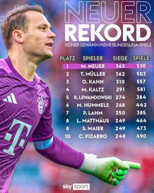 超越穆勒,诺伊尔530场363胜成德甲历史胜场数最多球员