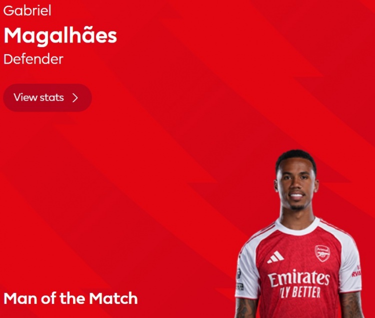 本场比赛加布里埃尔首发出战表现稳健,,贡献6次解围,赛后他也当选英超官方球迷票选全场最佳球员。