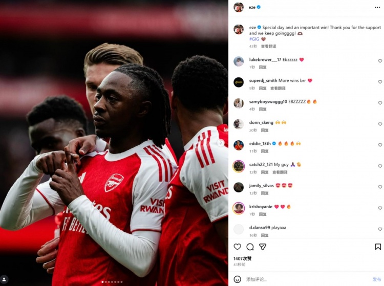 本场比赛埃泽面对旧主打进制胜球,赛后他在个人社媒晒出庆祝照,配文写道:“特殊的一天拿到一场重要的胜利,感谢大家的支持,我们继续前进!”