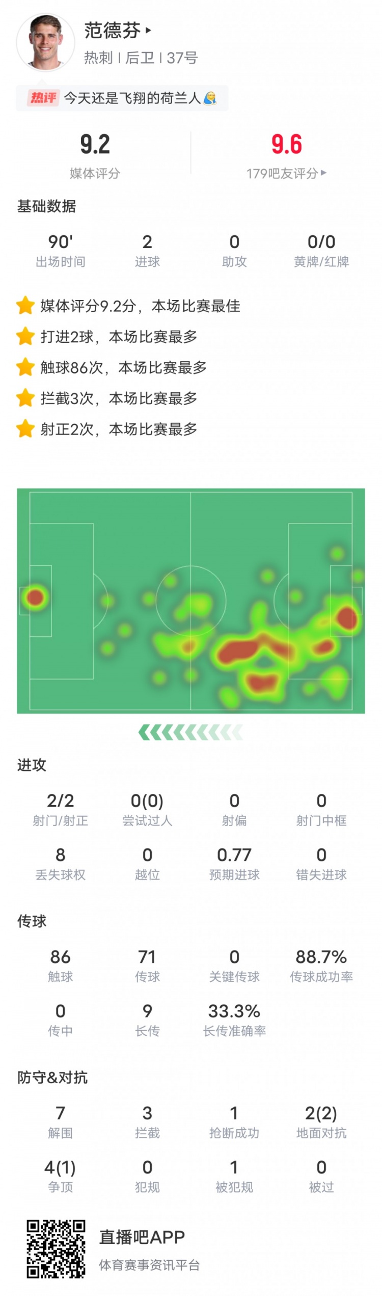 热刺官方宣布,范德芬当选为本场队内最佳球员。他因其“在攻防两端都具有统治力”的表现,赢得了75%的投票。