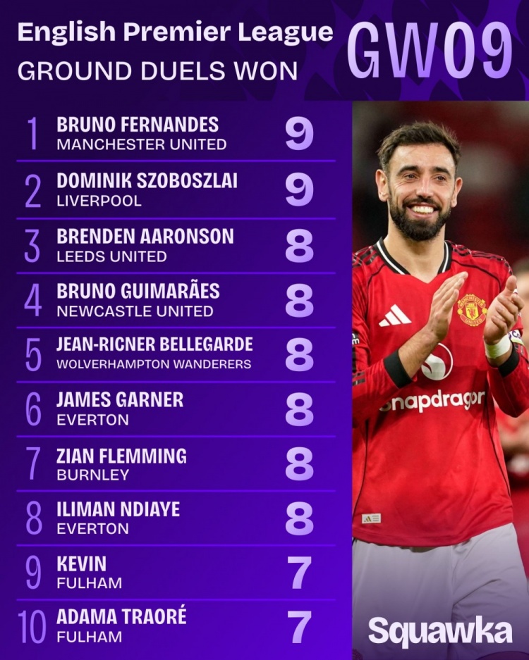 直播吧10月28日讯 英超联赛第9轮已经完赛,数据机构squawka统计了本轮地面对抗成功次数,曼联队长B费和利物浦中场索博斯洛伊并列居首。