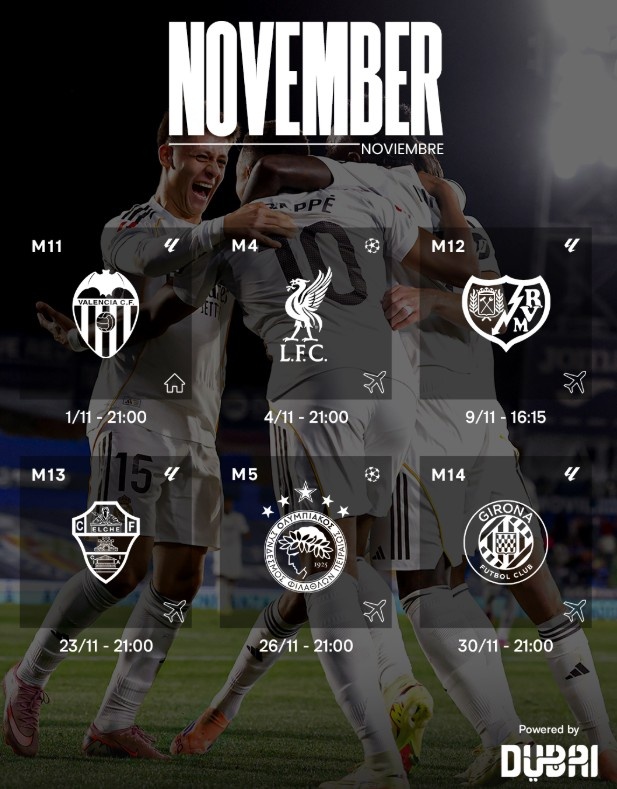 皇马官方晒11月赛程:主场战瓦伦西亚后将迎5连客,含客战利物浦