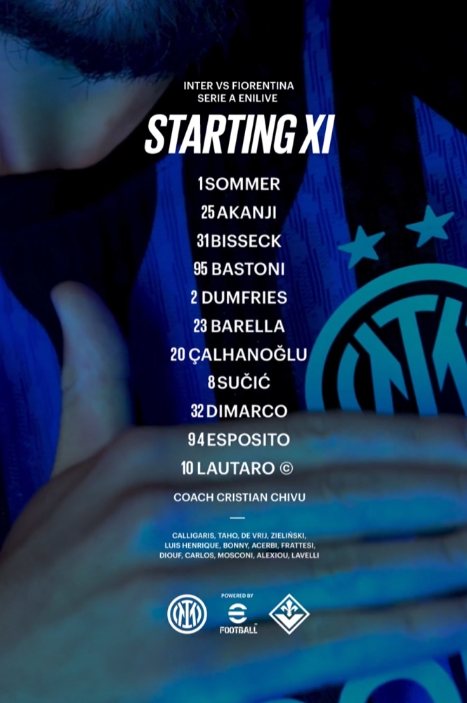国际米兰首发:1-索默、25-阿坎吉、31-比塞克、95-巴斯托尼、32-迪马尔科、2-邓弗里斯、23-巴雷拉、20-恰尔汗奥卢、8-苏契奇、94-埃斯波西托、10-劳塔罗